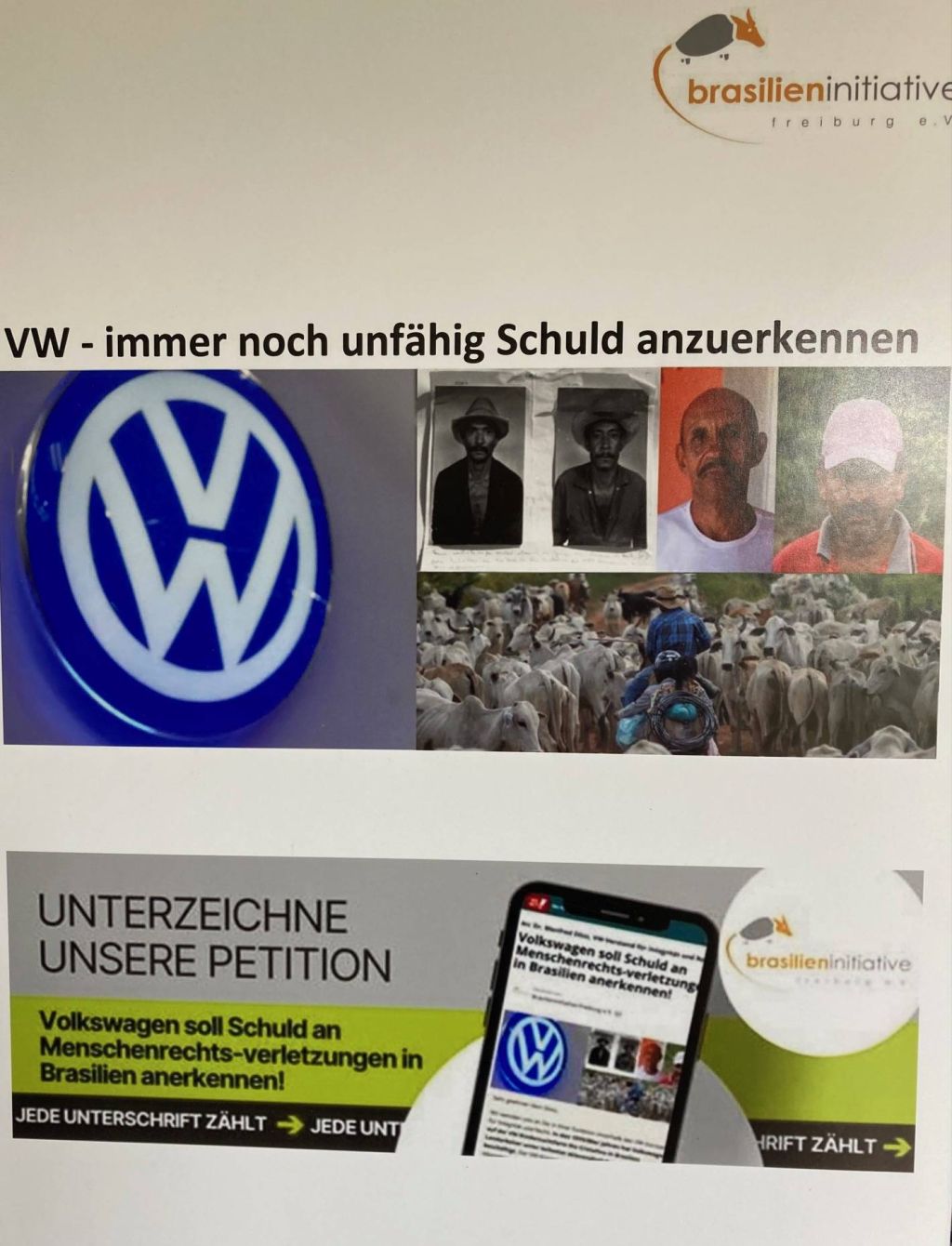 • Februar 2023: Online Petitionskampagne der Brasilieninitiative Freiburg e.V. auf campact. Fast 3000 Bürger:innen unterstützen die Forderung an VW, die Menschenrechtsverletzungen auf der Rinderzuchtfarm Rio Cristalino endlich anzuerkennen.